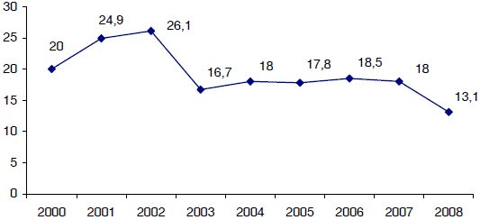 В 2008 г. инновационной деятельностью занимались 110 предприятий или 13,1 % промышленных предприятий области (в 2007 году – 142 предприятия или 18,0 %) (рис. 3.6). Область превышает общегосударственный показатель удельного веса предприятий, которые занимались инновационной деятельностью, в общем количестве исследуемых промышленных предприятий, которые в целом по Украине составляли 13,0 %. Среди регионов Восточной Украины Харьковская область по этим показателям опережает такие промышленно-ориентированные области, как Донецкая (10,5 %), Луганская (10,2 %), Запорожская (8,9 %), Днепропетровская (8,5 %) [157] .