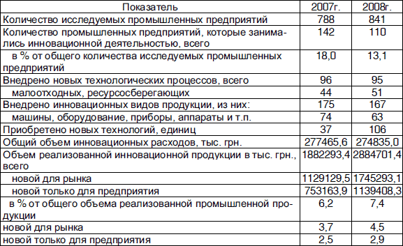 Объем инновационной продукции, реализованной промышленными предприятиями области в 2008 году, составлял 2884,7 млн. грн. Часть этой продукции в общем объеме реализованной промышленной продукции составляет 7,4 % (в целом по стране она равняется 5,9 %). Эти и другие показатели представлены в табл. 3.8 [158] .