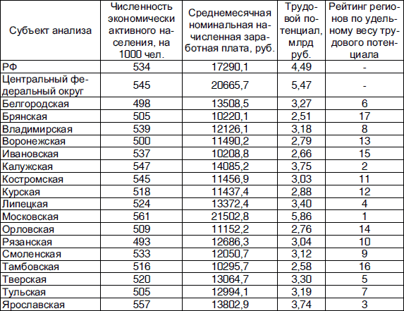 Таким образом, построение региональной системы управления формированием и использованием трудового потенциала, необходимо, на наш взгляд, в первоочередном порядке определить состояние трудового потенциала. Используем данные официальной статистической информации за 2008 г. по субъектам Центрального Федерального округа.
