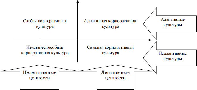 Таким образом, мы получаем модель, в рамках которой корпоративную культуру той или иной организации можно отнести к определенному типу по соотношению двух параметров: легитимности корпоративных ценностей и адаптивности, что позволит оценить ее эффективность (рис. 5.2). Данная модель наглядно иллюстрирует роль ценностей в рамках создания жизнеспособной организационной культуры. С ее помощью можно дать оценку жизнеспособности корпоративной культуры той или иной организации. Очевидно, что эффективность культуры тем выше, чем ближе показатели адаптивности и легитимности ценностей находятся к квадранту адаптивной культуры.