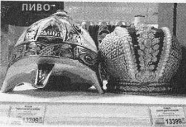 Если приглядеться к ценникам в «Седьмом континенте», то выяснится, что эти два странных предмета на самом деле — бутылки. Две бутылки водки. Одна называется «Иван Калита шлем», а другая — «Юрий Долгорукий». Здесь «прекрасно» все. Во-первых, цена. 13 399 рублей за штуку — это как раз $500 на тот момент, когда я делал это фото. Только очень богатый и одновременно очень пьяный человек способен на такую покупку. Или же очень глупый и подобострастный — на таких, видимо, и расчет. И получает начальство подарки — царские регалии с сорокаградусным содержанием...