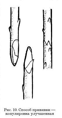 В качестве привоев используют вызревшие средние части однолетних веток с хорошо развитыми, не-подмороженными и не тронувшимися в рост почками. Техника прививки улучшенной копулировкой простая. Вся сложность заключается лишь в том, чтобы быстро, одним движением ножа, сделать одинаковой длины на подвое и привое ровные и гладкие косые срезы. Достигается это тренировкой и практикой.