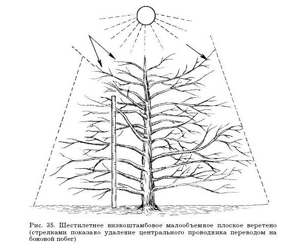 При формировании кроны в виде малообъемного плоского веретена требуется минимальная обрезка: ширина плодовой стены не превышает 2 м, получается хорошая освещенность на всю глубину кроны. После завершения формирования дерева с 5-6-го года проводят систематически прореживающую обрезку с целью лучшего освещения кроны, укорачивания полускелетных веток переводом на слабый побег, а также удаление сильных верхушечных.
