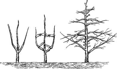 Рис. 37. Техника формирования комбинированной пальметты: а – весной 2-го года до образования угла отхождения; б – весной 2-го года после образования угла отхождения 60°; в – сформированное дерево в возрасте 5 лет
