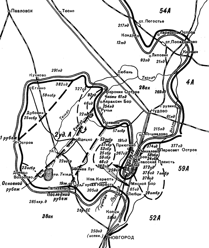 В апреле положение частей 2-й ударной армии в Мясном Бору стало еще труднее. Из-за весенней распутицы по дорогам не могли передвигаться даже повозки, и специальные группы солдат и местных жителей носили на себе боеприпасы и продовольствие за 30–40 км. 10 апреля начался ледоход на Волхове, и пока не были наведены наплавные мосты, снабжение наших войск еще более ухудшилось. Несмотря на то что в конце марта штабу Волховского фронта стало известно о подготовке противником новой операции по окружению и уничтожению 2-й ударной армии, по указанию командующего его войсками продолжалось планирование очередной, третьей операции по взятию Любани. Она началась 3 апреля. Удар наносился в 30 км южнее города в направлении деревни Апраксин Бор. Как и два предыдущих, и это наступление не принесло успеха, хотя 54-я армия Ленинградского фронта с конца марта отвлекла на себя крупные силы противника. После провала наступления командование 2-й ударной армией принял заместитель командующего войсками фронта генерал Власов.