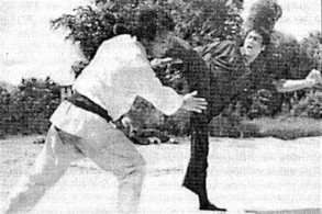 | Демонстрация главного положения джит кун до — реагирования в тот самый момент, как противник приоткроет себя. Брюс Ли (справа) выполняет «хук кик» в голову корейского представителя Хэпкидо Вон Ин Сика во время сцены из третьего фильма Ли на китайском языке «Путь Дракона» (в Северной Америке он называется «Возвращение Дракона») |