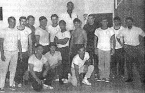 | Гоуппа «ищущих»: Брюс Ли (в центре) вместе с некоторыми из своих учеников джит кун до, в том числе Карим Абдул-Джаббаром (непосредственно за Брюсом), Дэниелом Ли (крайний слева в первом ряду) и Дэниелом Иносанто (стоит слева от Брюса Ли) тренируются «во внутренних поисках причины своего неведения» |