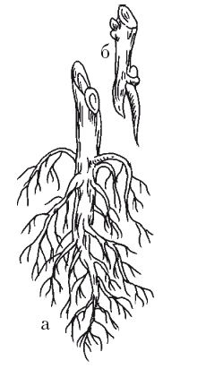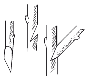 Почку, напротив которой делают косой срез, располагают внизу. Рукоятку ножа держат в правой руке, зажав ее четырьмя пальцами, пятый большой палец остается свободным. Затем правый свободный конец черенка вводят в ладонь правой руки, а часть с местом планируемого косого среза располагают между лезвием ножа и большим пальцем правой руки.