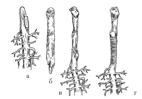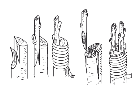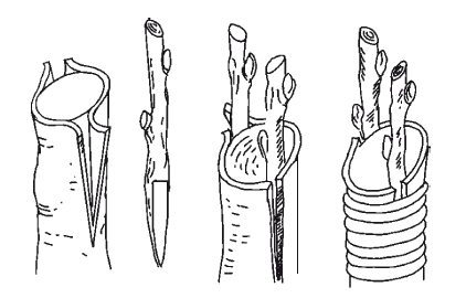 Остальную часть черенка срезают секатором над верхней выбранной почкой. На подвое в нужном месте делают косой срез, соответствующий по длине срезу на привое. После этого на косом срезе как подвоя, так и привоя на высоте 1/3 от острого конца начинают делать расщеп, доводя его примерно до половины косого среза. Затем привой и подвой совмещают так, чтобы язычки привоя и подвоя были вставлены один за другой, а камбиальные слои совместились по всей окружности косых срезов при одинаковой толщине привоя и подвоя или хотя бы с одной стороны при подвое более толстом, чем привой. Место прививки плотно обвязывают полихлорвиниловой пленкой снизу вверх без просветов и вверху завязывают узлом. Обвязка должна быть настолько плотной, чтобы привой трудно было вытащить наружу. Садовым варом смазывают лишь открытые поверхности срезов. Как только привитые части срастутся, обвязку снимают, чтобы после утолщения не образовались перетяжки.