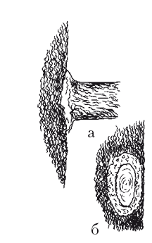 Виды спилов: а – спил «на кольцо» производится перед характерным наплывом коры у основания ветки; б – такой спил легко зарастет, так как он окружен зоной быстро делящихся клеток