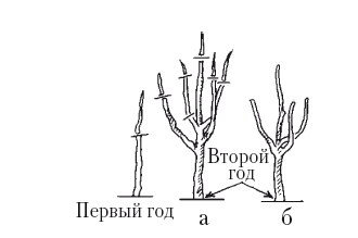 В том случае, если саженец имеет 4–5 основных веток, то в первый год выбирают две ветки, расположенные супротивно, и коротко обрезают их на одном уровне. На второй год из выращенных на центральном проводнике ветвей выбирают еще одну или две основные, а проводник вырезают.