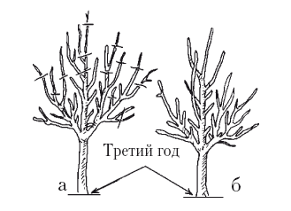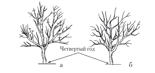В следующие четыре года проводят такие же операции по формированию кроны, что и на втором году жизни. На пятом-шестом году центральный проводник удаляют переводом на слабую горизонтальную ветку.