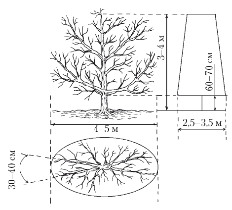 Такую крону формируют из 3–4 основных ветвей с расстоянием между ними до 20 см. Угол отхождения главных ветвей должен быть в пределах 60°, а угол расхождения между основными ветвями – 90°.