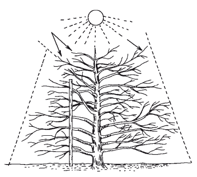 Чтобы не допустить раннего загущения кроны, прежде всего не следует закладывать большего количества основных ветвей, чем это предопределено системой формирования кроны.