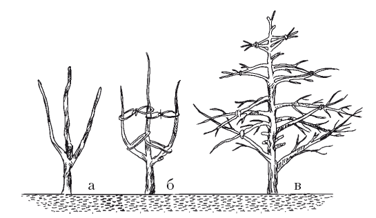 Техника формирования комбинированной пальметты: а – весной второго года до образования угла отхождения; б – весной второго года после образования угла отхождения 60°; в – сформированное дерево в возрасте 5 лет