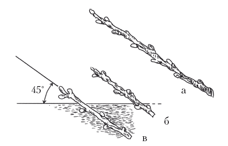 Для того чтобы черенки не подсыхали, их оставляют на некоторое время в прохладном месте или ставят в воду. Для хорошего укоренения черенки следует сначала выдержать в воде в течение 3–4 недель. Концы черенков погружают в воду на 1/3 длины или же обрабатывают их ростовыми веществами.