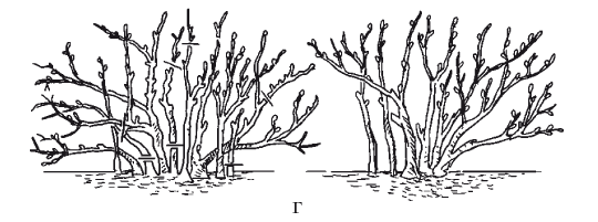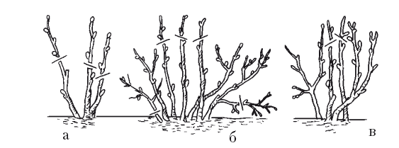 У правильно сформированного взрослого куста в конце вегетации имеются ветви разных возрастов. Лучше всего оставлять в кусте 10–15 скелетных ветвей всех возрастов, примерно по 2–4, при этом однолетних оставляют на 1–2 ветви больше, 4–5-летнего возраста – на 1–2 меньше.