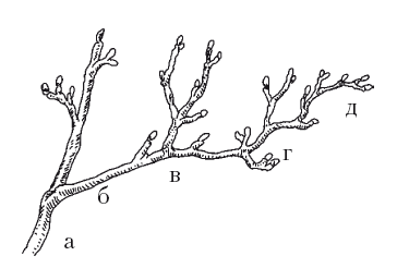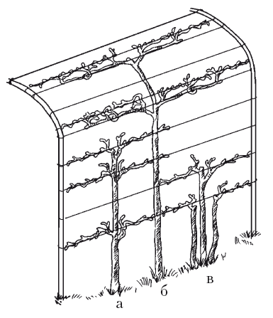 а) веерный многорукавный – оставляют по 1–2 пасынка в зоне первой проволоки на каждом побеге, а верхушку самого побега прищипывают, т. е. удаляют;