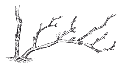 Четвертый год. Весной, до распускания глазков, формируют плодовые звенья: ближайший к штамбу или рукаву побег обрезают на 2–3 глазка – образуют сучок замещения; второй побег располагается горизонтально – образуют плодовую стрелку. Остальной прирост удаляют.