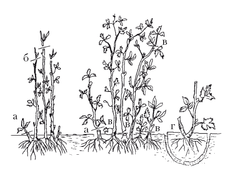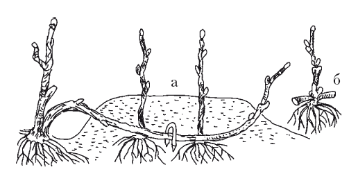 Если проводить размножение осенью, когда опадут листья, почву вокруг куста нужно хорошо обработать и внести в нее органические и минеральные удобрения, заготовить крючки от любого дерева длиной 20–30 см и, сделав небольшую лунку в месте прищепления, выбрать нужную ветку, наклонить ее к земле и в подготовленной лунке хорошо прижать. Свободный конец ветки, прижатой доской или другим предметом, выровнять по вертикали. Весной эта ветка начнет хороший, нормальный рост.