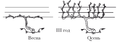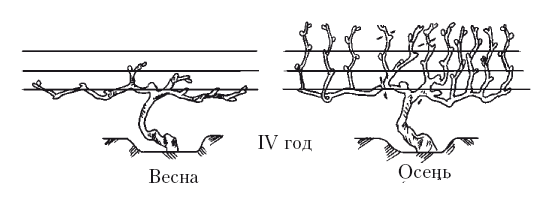 Четвертый год. Весной из прошлогодних одревесневевших побегов формируют плодовые стрелки. При короткой обрезке до 3-х глазков они остаются вертикальными в виде сучков, при обрезке на 4–5 глазков и более их кладут горизонтально и подвязывают к дополнительно натягиваемой проволоке на расстоянии 5–10 см от проволоки, на которой закреплен кордон. Остальное – как в предыдущей формировке.