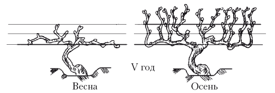 Пятый год. Весной удаляют всю прошлогоднюю плодовую стрелку со всем приростом, а с побегов на сучке замещения формируют плодовое звено: ближайшую к штамбу или рукаву однолетнюю лозу обрезают коротко на сучок (2–3 глазка); следующая лоза – стрелка на плодоношение. Дается полная нагрузка, куст считается вступившим в полное плодоношение. Отныне так повторяется каждый год: прошлогоднюю плодовую стрелку со всеми лозами удаляют, а из побегов, выросших на сучке замещения, формируют новое плодовое звено. Твердо зная принципы формировки, обрезки и нагрузки куста, начинающий виноградарь никогда не допустит грубых ошибок.