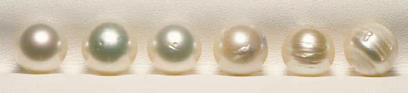 Розовые оттенки желательны для белого жемчуга и видимы на темных участках жемчужины. Зеленоватые или желтоватые оттенки уменьшают стоимость белого жемчуга. Иногда видны переливающиеся цвета радуги. Переливчатость жемчуга всегда считается показателем высокого качества.