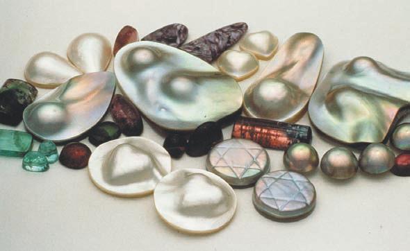 Рис. 6.8 Культивированный жемчуг «мабэ» и бугорки на перламутровом слое с вкраплениями розового кварца, турмалина, хризопразовых и танзанитовых кабошонов. Камни от King’s Ransom; фото Рона Фортъера.