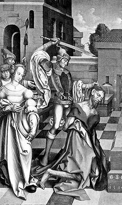 Рис. 1.54. Картина Ганса Фриза «Усекновение головы Иоанна Крестителя». Базельский художественный музей. Она датируется якобы 1514 годом. Однако, скорее всего, это 1614 или 1615 год. То есть, на сто лет ближе к нам. Обратите внимание, что первая «цифра» записана как буква «I» (с точкой!), то есть как первая буква имени Иисус. Взято из [104], номер 10