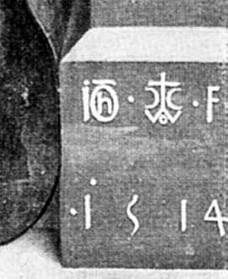 На рис. 1.54 приведена картина Ганса Фриза «Усекновение головы Иоанна Крестителя». Внизу проставлена дата, рассматриваемая сегодня как 1514 год, рис. 1.55. Однако, как мы уже объяснили, старое цифровое значение символа 5 было ШЕСТЬ. Так что, скорее всего, это 1614 год или 1615 год. Обратите также внимание на запись первой цифры «один». Это — явное «И с точкой», то есть 1. Кроме того, впереди поставлена еще одна точка. Итак, в качестве «первой цифры» мы видим I, то есть первую букву имени Иисус. Это в точности отвечает нашей реконструкции.