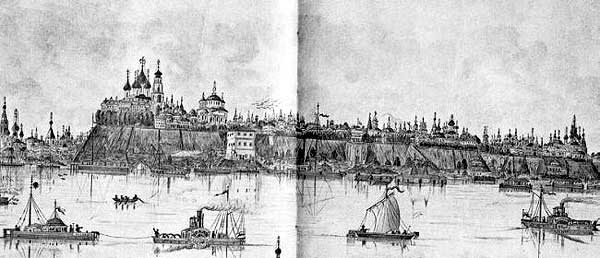 Рис. 2.6. Фрагмент старинного изображения города Ярославля, начала XVIII века. Башни есть, а стен нет