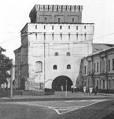 Рис. 2.2. Власьевская (Знаменская) башня прежних мощных крепостных укреплений Ярославля — Великого Новгорода, срытых во время новгородского погрома. Вид с запада. Взято из [796], с. 73. На левом углу Знаменской башни отчетливо видны остатки кирпичной крепостной стены, когда-то отходившей от этой башни. Стену разрушили (срыли) и от нее остался рваный след