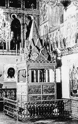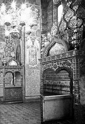 Знаменитое московское «Царское место» в Успенском соборе Московского Кремля устроено, по-видимому, по образцу ярославского «Царского места». Которое сохранилось до наших дней. На рис. 2.3 показано Царское Патриаршее место в Ярославле. На рис. 2.4 приведено, для сравнения, «Царское место» в Успенском соборе Московского Кремля. Ясно видно, что оба сделаны очень похоже.