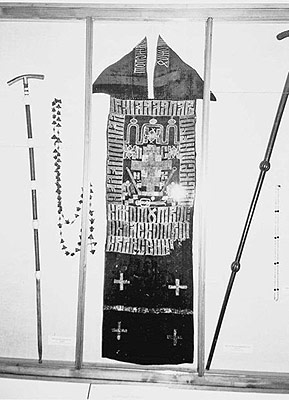 Рис. 1.28. Витрина музея «Терем царевича Дмитрия» в Угличе с иноческими одеяниями Симеона Ульянова. XVII век. Извлечены из захоронения в 1942 году. Фотография 2000 года