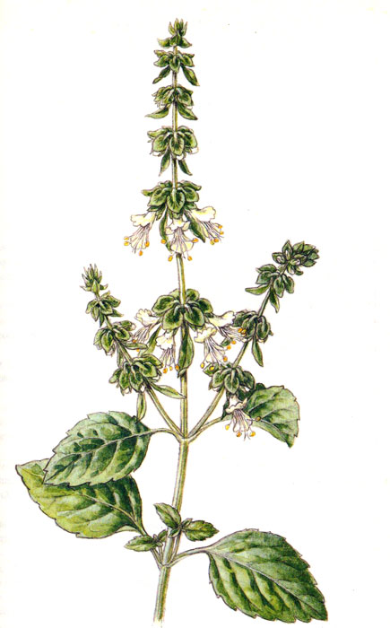 Описание. Стебель растения высокий, ветвистый, с черешковыми, заостренными, мелкозубчатыми листьями удлиненно — яйцевидной формы. Размятые листья издают сильный аромат. Цветки белые или красные, вырастают из пазух верхушечных листьев и прицветников в неправильных мутовках. Цветет в летние месяцы. Размножается семенами.