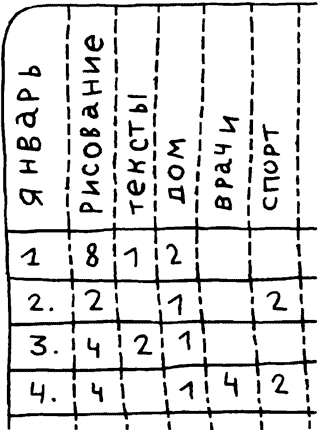 Иногда я думаю, что мне хотелось бы повторить подвиг Любищева и действительно записывать каждую свою минуту на протяжении 56 лет. Я даже не знаю точно, зачем это нужно. Наверное, просто хочется совершить подвиг. С другой стороны, я чувствую, что за таким подвигом могут скрываться великие открытия. Если еще точнее, еще аккуратнее, еще подробнее все записать, подсчитать, наверняка узнаешь еще что-то неожиданное! Или успеешь еще больше? Может быть, узнаешь что-то обнадеживающее, о чем никто не мог даже подозревать? А может быть, навсегда успокоишься, в полной мере осознав, что все это на самом деле не имеет никакого значения — ни записанное время, ни выполненные задания, ни свернутые горы. Может быть, единственное, что важно, — это ощущение, что я живу полной жизнью. Но ощущение это складывается, естественно, не из вымытых посуд, приготовленных обедов и даже не из опубликованных книг и проданных картин.