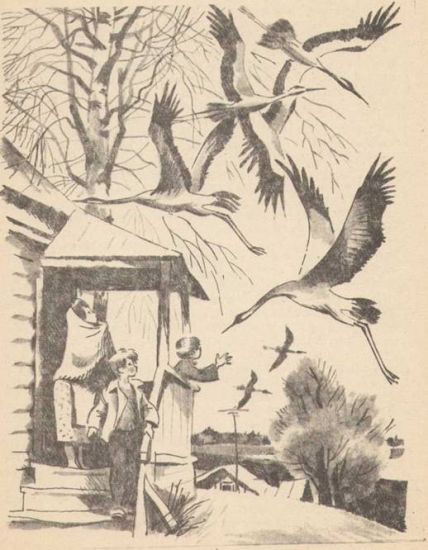 Потом стая взлетела ввысь и пошла на журавлиные болота, но один журавль задержался, он пролетел совсем низко над младшим мальчиком и коснулся его крылом, словно подал руку на прощанье.
