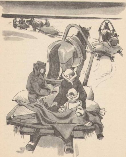 Я засыпал и просыпался. Однажды свет скользнул по саням, по тускло блестевшим лошадиным крупам. Это мы обогнали татар. Мне опять стало немного страшно. А вдруг мотор заглохнет и татары нападут на нас… Но машина шла и шла вперёд, и обоз остался позади. Теперь перед нами была только ночь и совсем не было деревьев.