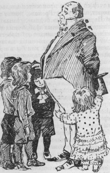 Доктор поднялся, собираясь уходить, но тут на него обрушилась давно нависшая угроза нападения. Дети разом повскакали со стульев и мигом объединились для совместной атаки. Не успел доктор шевельнуться, как двое старших уже повисли у него на плечах, младший мальчуган обхватил за пояс, а девчушка вцепилась ему в ноги.