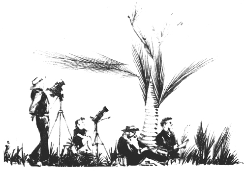 Мы услышали возбужденное щебетанье вымпеловых райских птиц и их трели, напоминающие «вавк-вавк-вавк», еще за пятьсот метров. Птицы были так увлечены своим делом, а их состязание шло настолько интенсивно, что они напоминали стайку воробьев и не обращали внимания на наблюдателей. Деревья, служившие подмостками для этого представления, стояли на склоне холма; птицы облюбовали два определенных места. Некоторые предпочитали собираться высоко вверху, на ветвях двух самых высоких деревьев. Их было плохо видно с земли, так как они находились слишком высоко; большинство энергично перепархивало с ветки на ветку, хотя, как нам показалось, один или два самца, обладавших определенным приоритетом, оказывались в центре внимания чаще других.