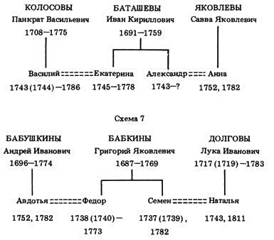 Свойственные отношения московских старинных именитых родов устанавливались также с некоторыми из «прибылых» именитых граждан. Бабушкины, например, были связаны через крупных во второй половине XVIII в. суконных фабрикантов и первогильдейских купцов Бабкиных с Долговыми, происходившими от калужских купцов (см. схему 7).