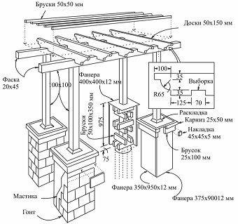 Трельяж служит для создания тихих уголков отдыха, ограждения хозяйственных площадок и узлов технических служб, прикрытия маловыразительных парковых участков и самотехнических узлов. Его устанавливают на опорах, которые утапливаются в заранее выполненные фундаментные стаканы размером 40x40 см на глубине 15 – 20 см от поверхности газона или дорожки. Деревянные и металлические элементы окрашивают нитроэмалевыми или масляными красками или прозрачным нитролаком, но спокойных тонов.