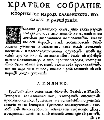 Рис. 18. Первая станица русского издания книги Мавро Орбини. 1722 год