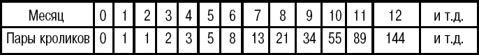 Решая задачу о годовом приплоде пары кроликов, которые размножаются каждый месяц и рождают по паре крольчат, начиная со второго месяца от рождения, Фибоначчи выстроил прогрессию увеличения поголовья кроликов (табл. 7).Таблица 7. Решение задачи Фибоначчи