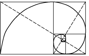 Если от него отрезать квадрат, то оставшаяся часть представляет собой золотой прямоугольник. Этот процесс можно продолжать до бесконечности. А если провести диагональ первого и второго прямоугольника, то точка их пересечения будет принадлежать всем получаемым золотым прямоугольникам. Точки, делящие стороны в божественной пропорции, лежат на закручивающейся внутрь логарифмической спирали – единственной спирали, которая не меняет своей формы при изменении размеров (рис. 40а).