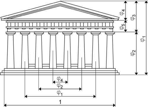Красивое здание обязательно должно быть построено по законам золотого деления. Так ли это на самом деле? Одним из эталонов пропорциональности и уравновешенности является греческий Парфенон, храм, посвященный богине красоты и любви Афродите. На плане его фасада (рис. 41) можно увидеть, что практически нет ни одной детали конструкции, которая не имела бы отношения к золотому сечению. Археологами был найден даже особый циркуль (с заложенными пропорциями золотого сечения), которым пользовались архитекторы и скульпторы античного мира.