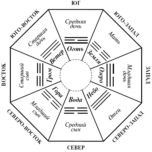 Триграммы соответствуют членам семьи и представляют собой взаимодополняющие противоположности. Главные триграммы означают отца (Небо) и мать (Земля). Старший сын и старшая дочь – Гром и Ветер. Средний сын и средняя дочь – Вода и Огонь, младший сын и младшая дочь – Гора и Озеро.