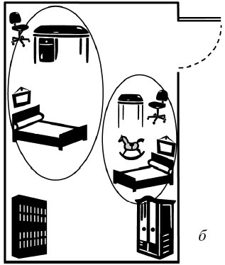 Рис. 45. Зонирование детской: а – для двух мальчиков; б — для двух девочек