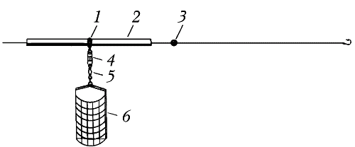 Рис. 14 Оснастка фидера с кормушкой на трубочке-противозакручивателе: 1 — колечко с отверстием для карабина; 2 — трубочка-противозакручиватель; 3 — стопорная дробина; 4 — карабин; 5 — вертлюжок; 6 — сетчатая кормушка на базе свинцовой пластины