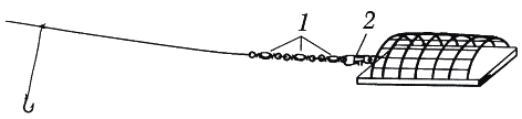 Рис. 15. Оснастка фидера с кормушкой на конце лески: 1 — вертлюжки; 2 — карабин